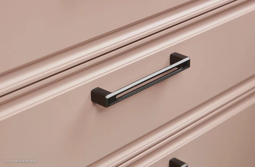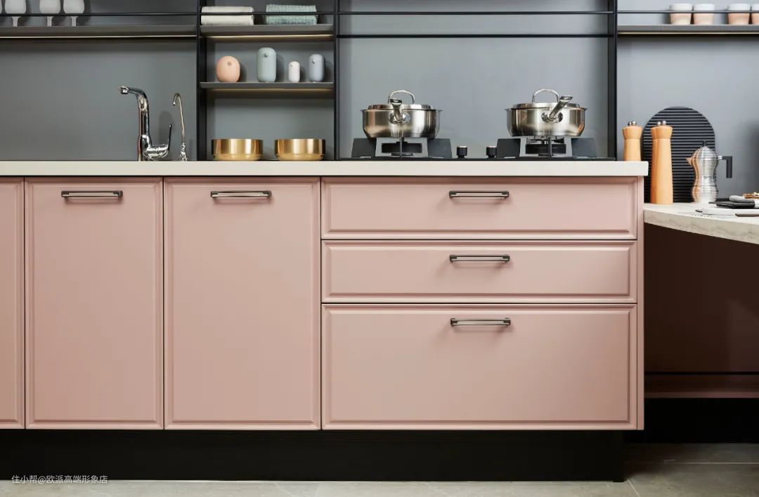 莫兰迪系脂粉与暖白色调的糅合,贯彻了简约的设计理念,展现特有的结构魅力。造型百变的吸塑门板,搭配沉稳的金属拉手,让灵动的空间更显质感。金属开放柜,收纳法宝的同时兼具展示。