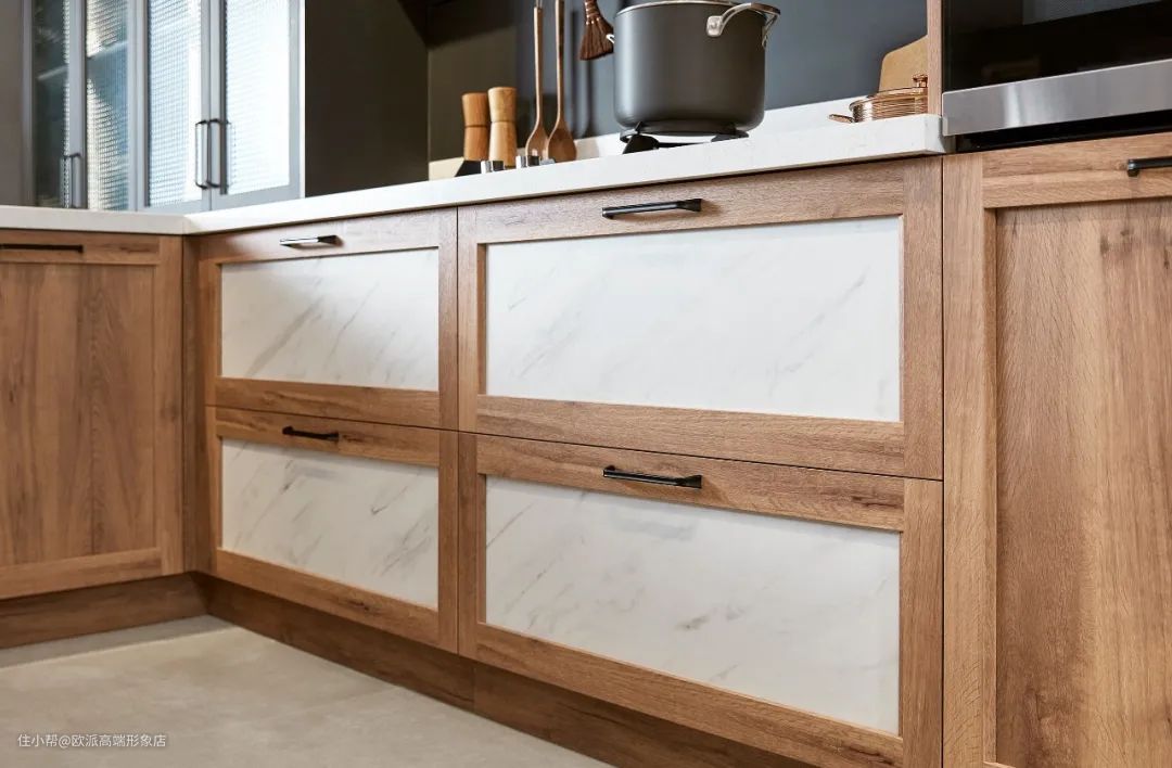 自然原木纹+石纹的拼色门板,打破了单色设计,清新中带着粗犷的独有气质。深灰色边框和方格玻璃的加入,展现出优雅大方,又不失时尚简约的设计。中西厨结合的岛台丰富了厨房的功能。