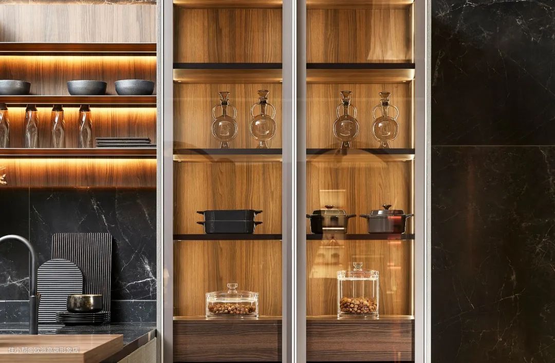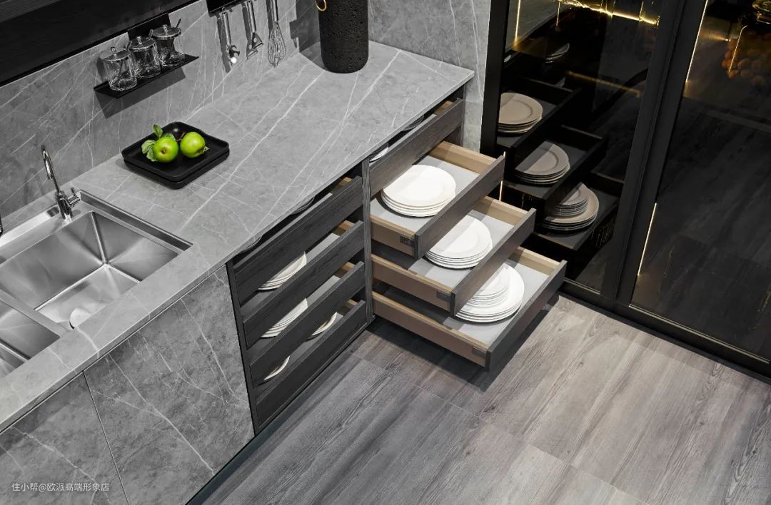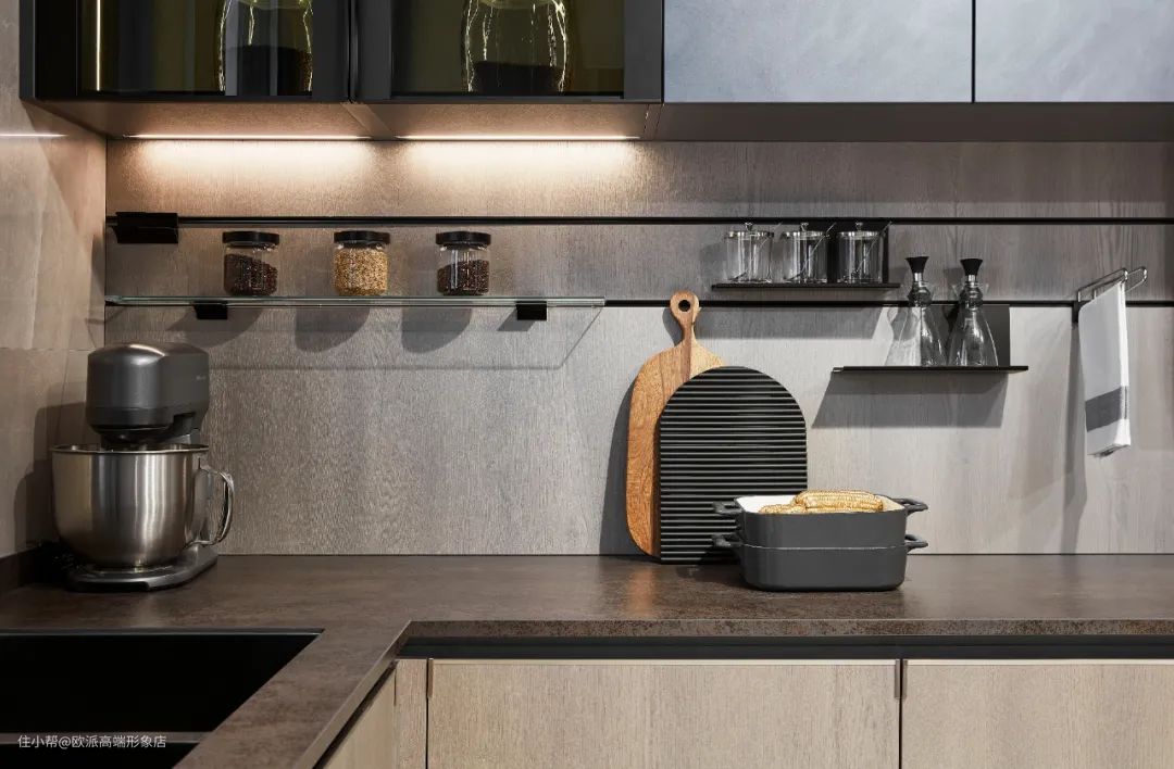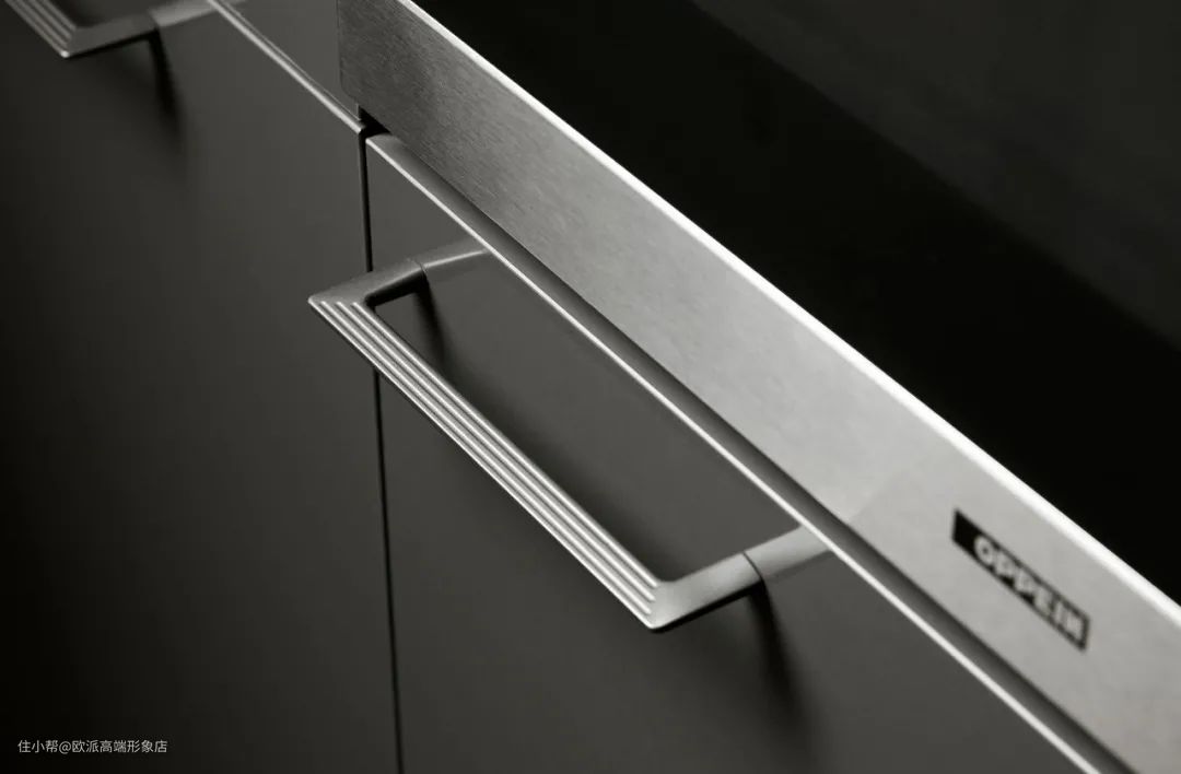 金属线条与创意拉手的混搭,再加上纹理独特的绅士灰门板,沉稳中透露着果敢。纤薄的金属层板设计,从正视面上看,减少了78%的视觉面积,强化了整个开放柜的品质感。