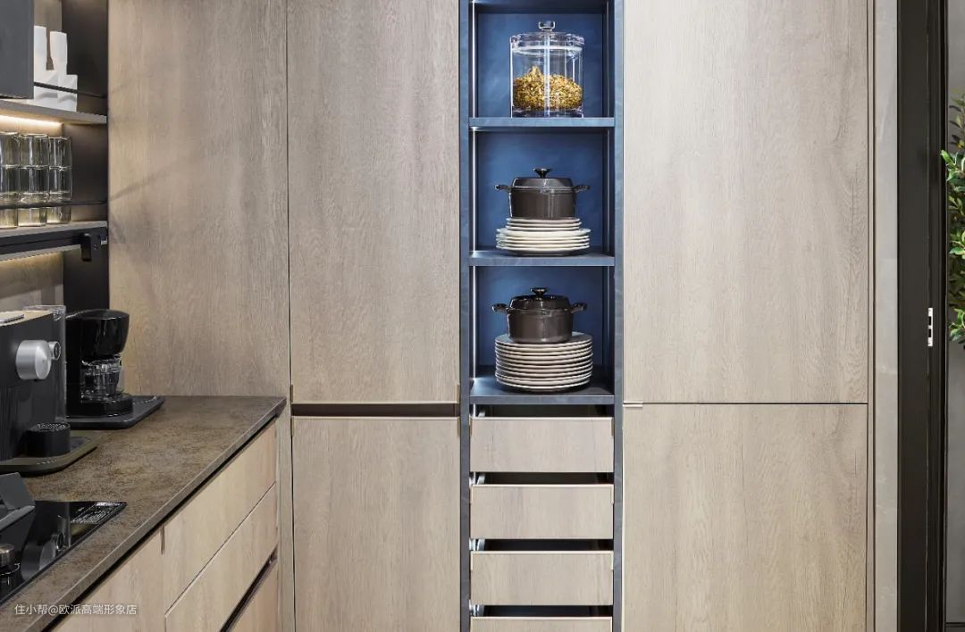 整体以松叶青门板和深色木纹背板的结合设计,搭配独特的曲线门型,简约又不失层次感。看看近20mm厚度的门板,实现了拉手功能与装饰功能,工业风韵味十足,深邃而有质感。