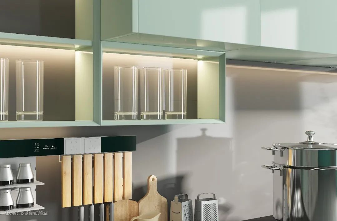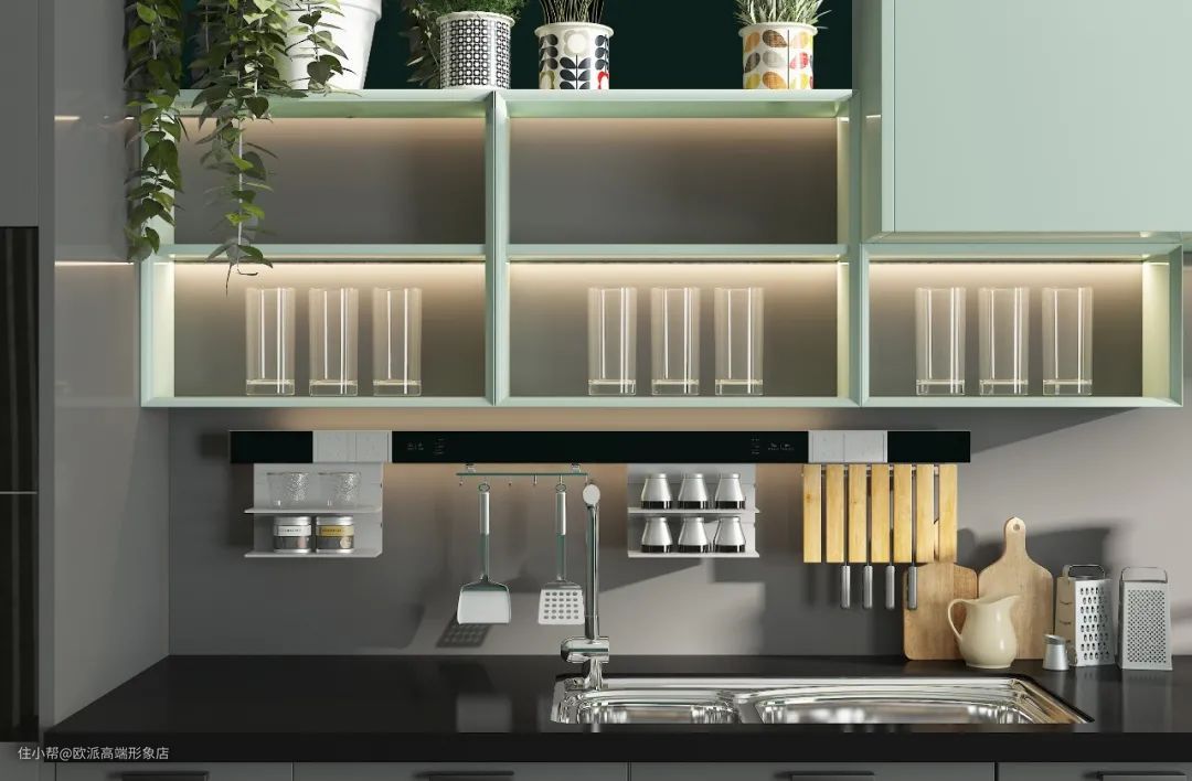 浅绿与高级灰的搭配,将清新与沉稳完美融合,选取规整有序的块状门板,以简单的线条碰撞。开放柜里的精致灯光,将物品映衬的如奢侈般亮丽,空间感十足。