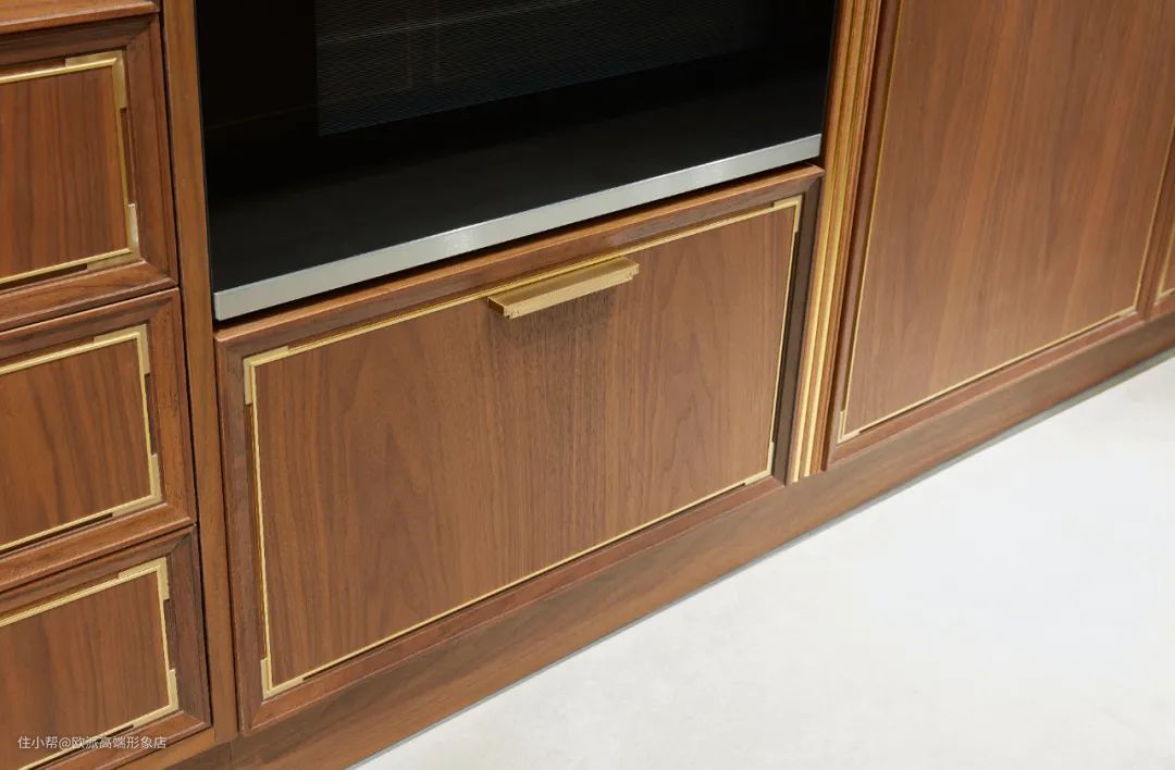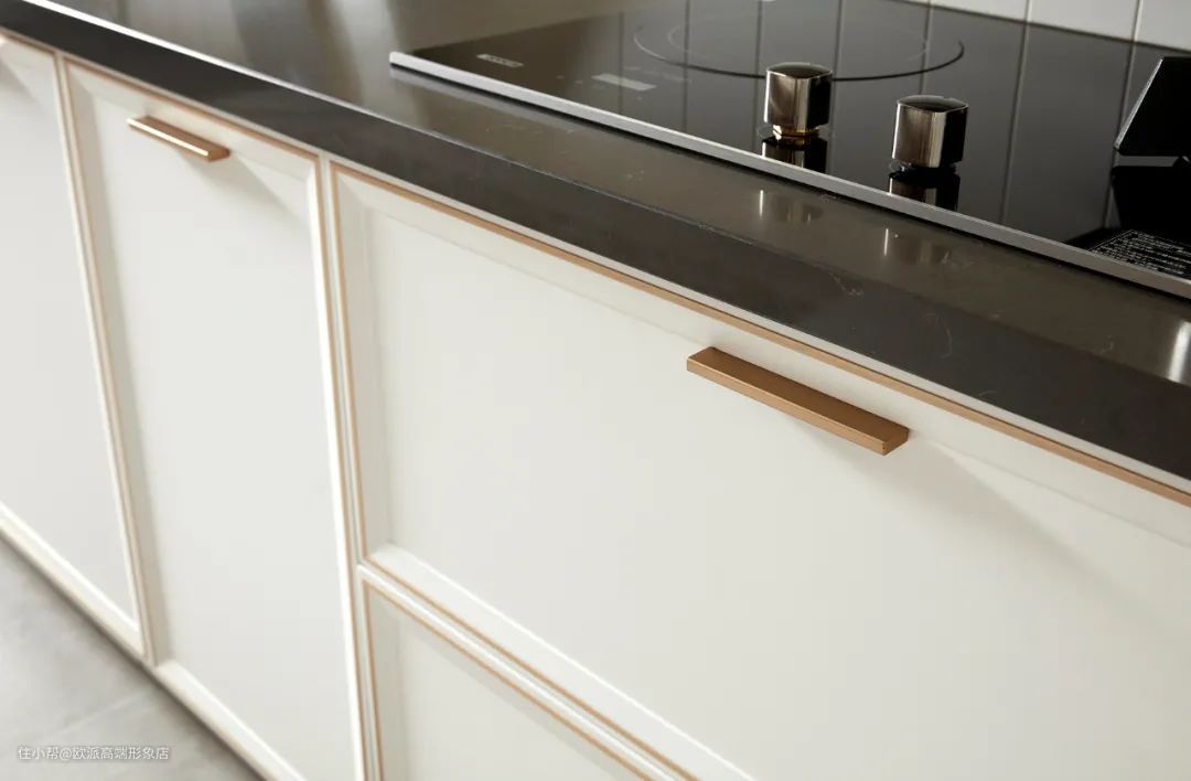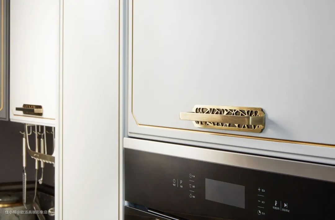 以传统白色与高级灰色为主调色,吊柜+地柜+岛台的设计,加上金色边框的点缀,如艺术品展示柜般精致。岛台脚采用了格栅设计,竖直的线条起到了拉伸视觉效果的作用。