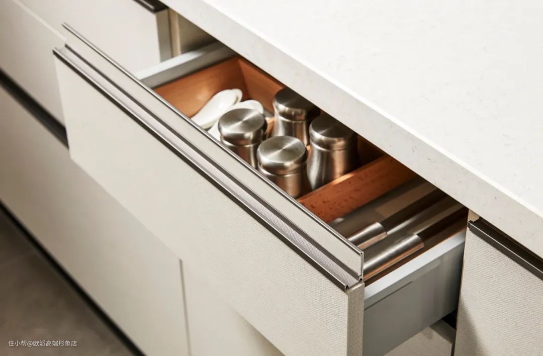 配色上是经典的白色系,柔雅白显得格外简洁明亮,在视觉上也有扩大空间的效果。设计上是简约的一字型金属拉手,与门板上的金属线条相呼应,营造质感、奢华的空间氛围。