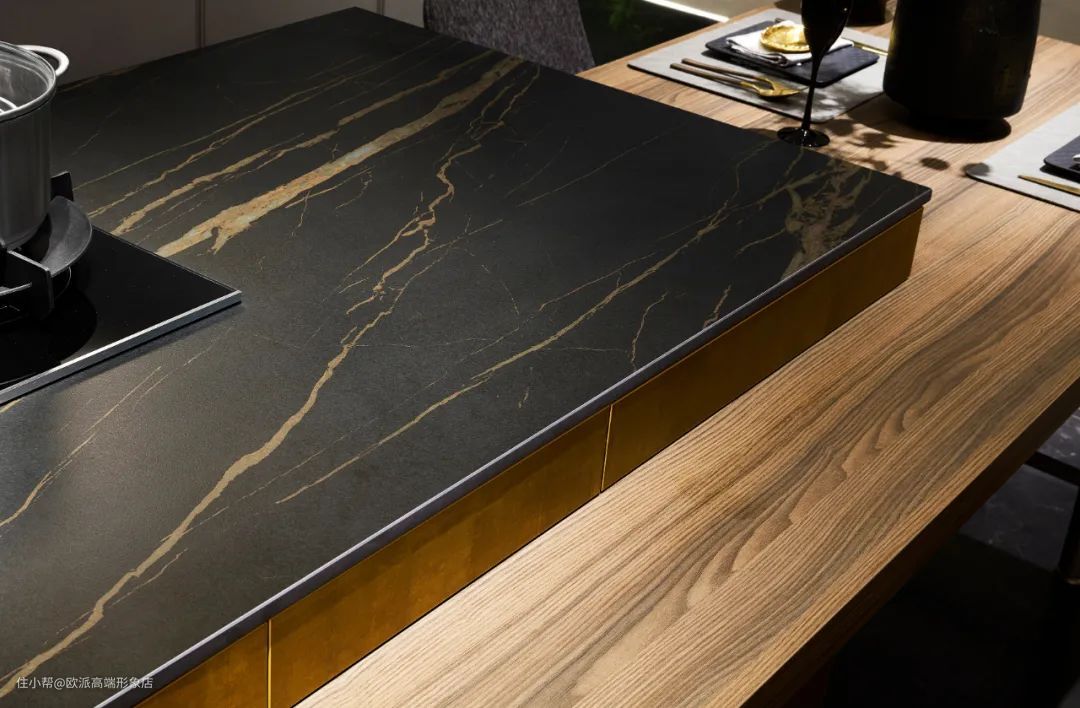 简约的外表下,加上时尚质感的香槟色金属铝框,精致优雅又不失气场。白色系与深色系统一了空间色调,整体看起来干净利落,又不缺乏高级感。大理石进口岩板纹理丰富,触感光滑细腻。