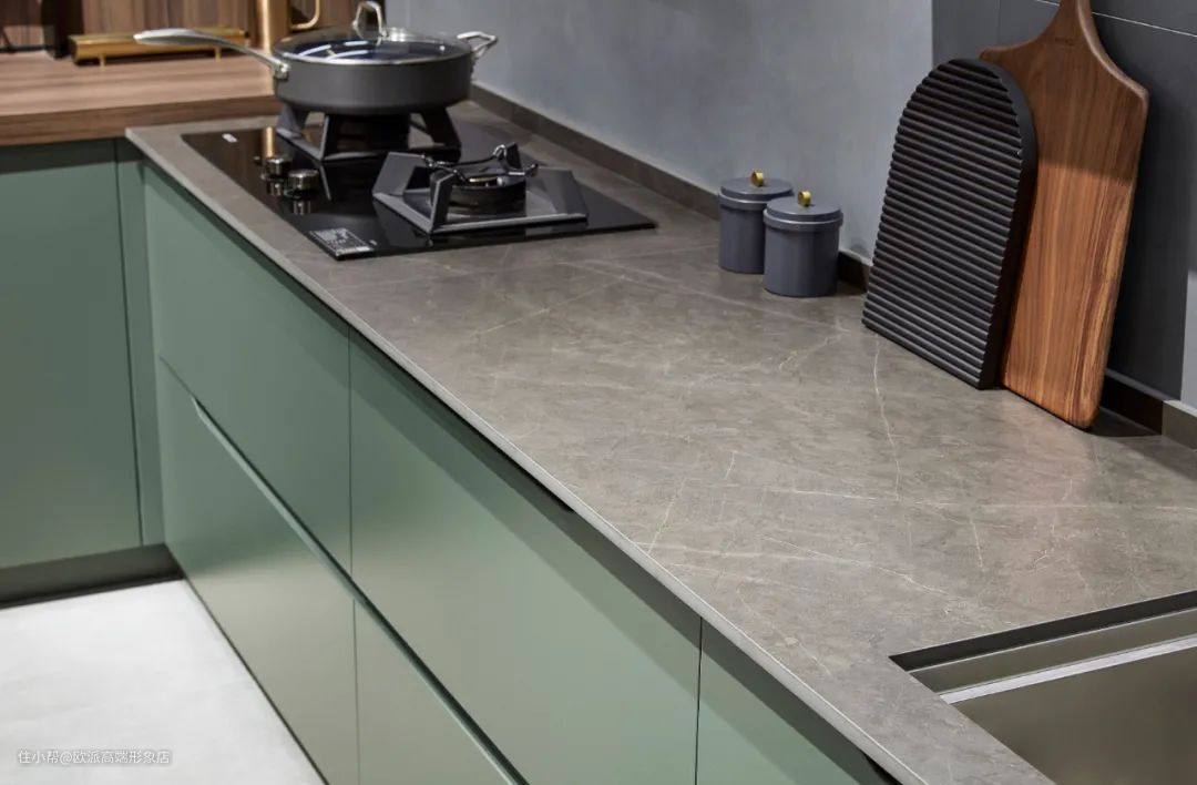 深灰色门板与台面的花色协调统一,表面纹理富含的自然神韵,赋予了厨房更多的灵动性。橱柜采用了嵌入式设计,实现了空间最大化利用,达到与橱柜的完美结合。