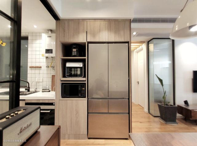 如果客餐厅都没办法放的时候,还可以放玄关,直接嵌入玄关柜即可,虽然可能离厨房稍微有些远,但也不会特别麻烦,刚回家就能取到食物。饮料和零食比较方便。