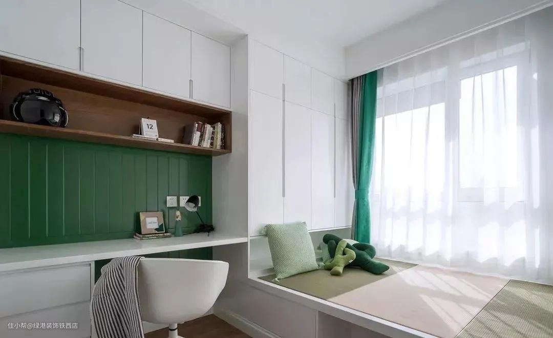 如果家里没有书房也可以考虑将飘窗设计为书桌,借助窗户与床的距离安装一个桌子或者依靠窗的位置,定制一个书桌,觉得飘窗小的也可以装L型的转角书桌。