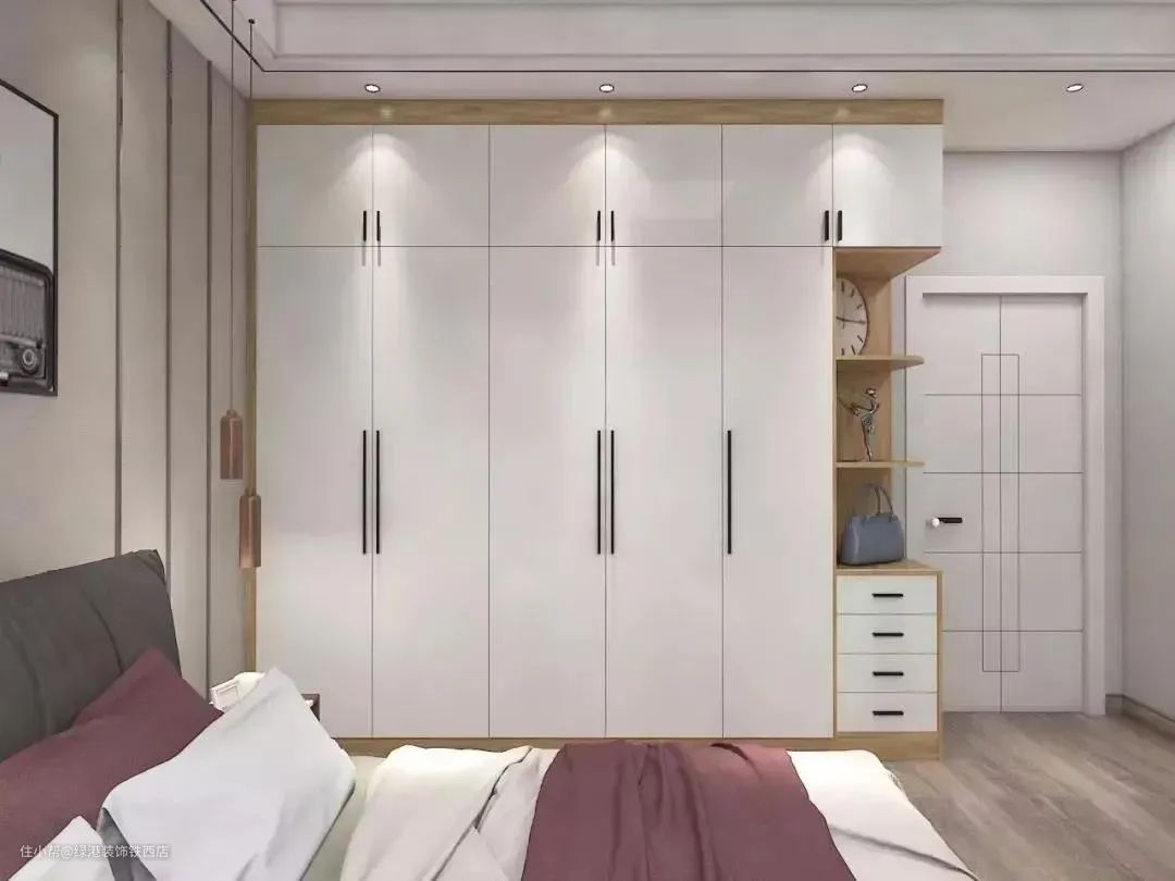 卧室衣柜做到顶可以最大程度的利用空间进行收纳,也可以防止顶部积灰不易清洁。另外一字型的衣柜实用耐看,不受风格的限制比较好搭配。