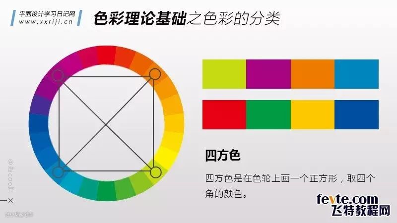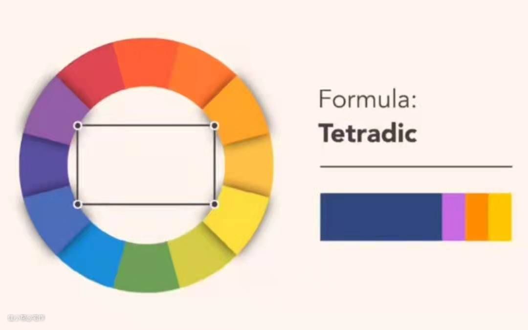 四方色是在色轮上画一个正方形,取四个角的颜色。在上面的例子中是:紫红色、橙黄色、黄绿色和蓝紫色。这个颜色真的超棒的,不信可以自己用用感受一下,尤其是使用其中一个颜色作为主色,其他的三个颜色作为辅助色的时候。