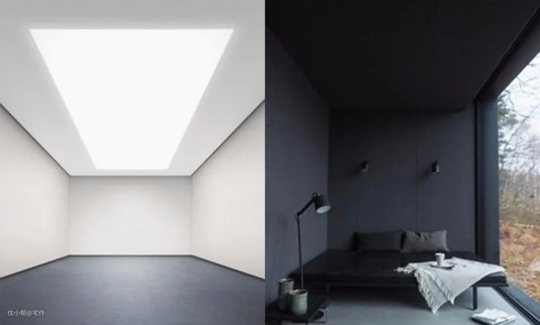 如果想让小空间产生宽敞的视觉效果,最有效的办法就是使用浅色系设计,利用浅色对于自然光线的高反射率来增加墙面的视觉尺度。而在某些特定的功能需求空间,方案中需要刻意让空间小的更紧凑,更沉静舒适,则可以选择将墙面变成更为深沉的颜色,由于深色会吸收掉大部分的自然光,从而产生封闭感,在视觉和心理上辅助空间的功能实现。