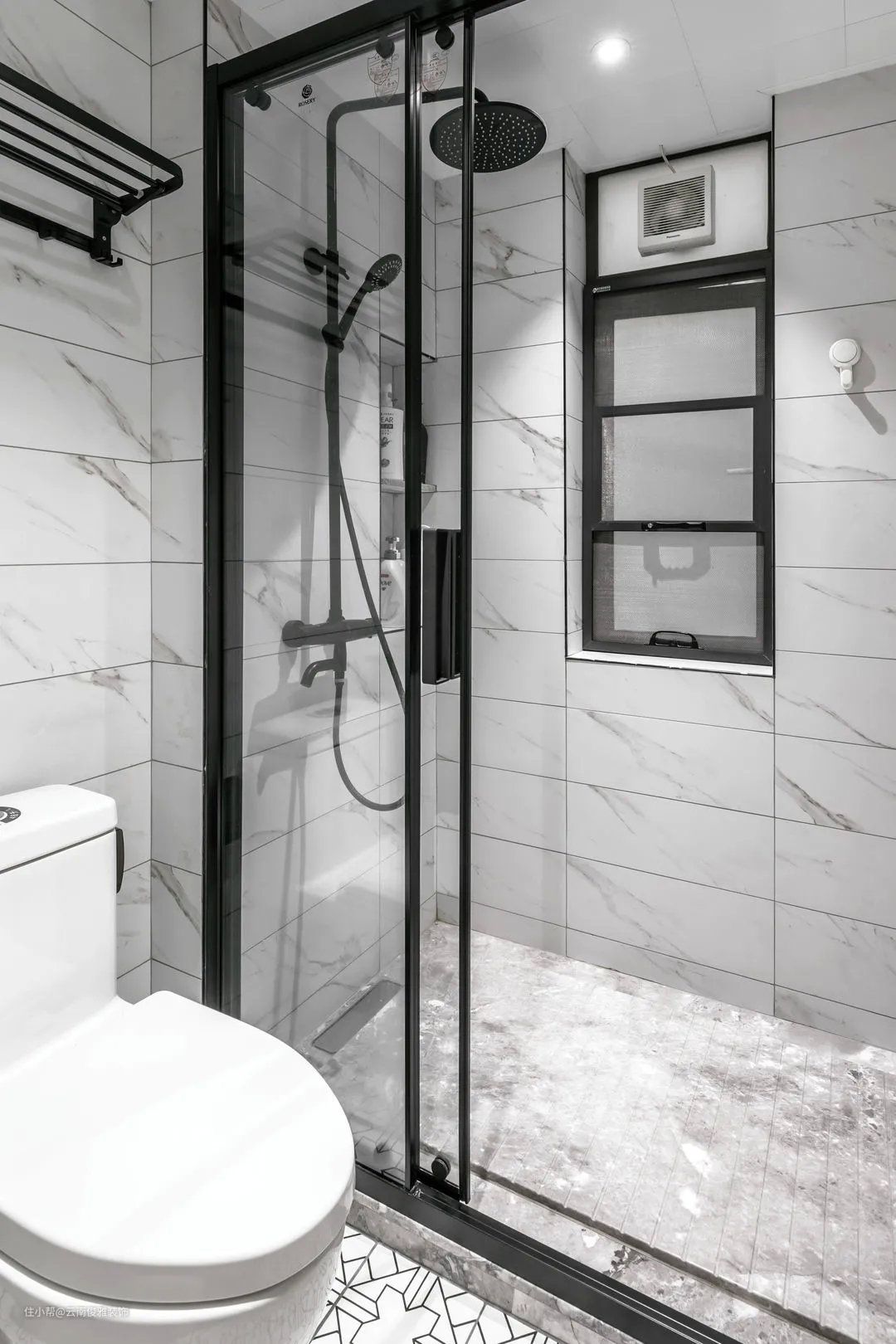 ▲卫生间,通过黑框玻璃推拉门做干湿分离设计,让日常生活更加舒适便捷。整体以黑白色为主,简约耐看又不失格调。