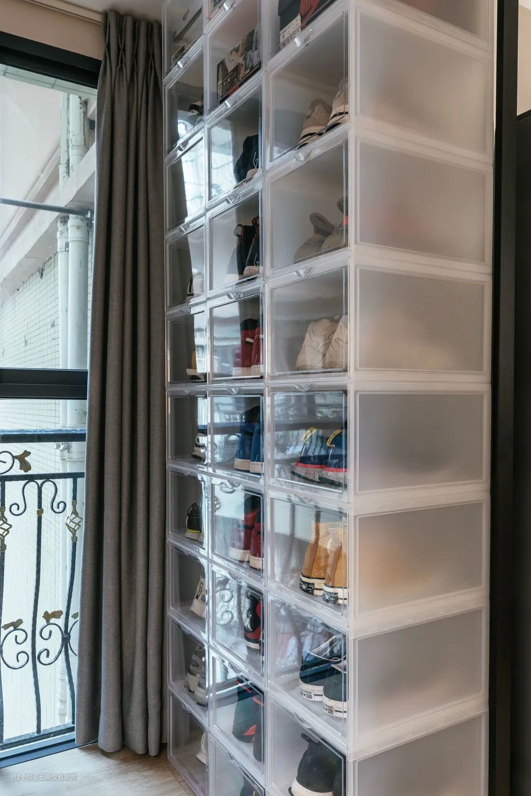 ▲将进门左手边的阳台打通,包进玄关空间,扩大了使用面积。定制了整面墙的到顶玄关柜,对面是顶天立地的鞋盒,提供了充足的收纳空间。