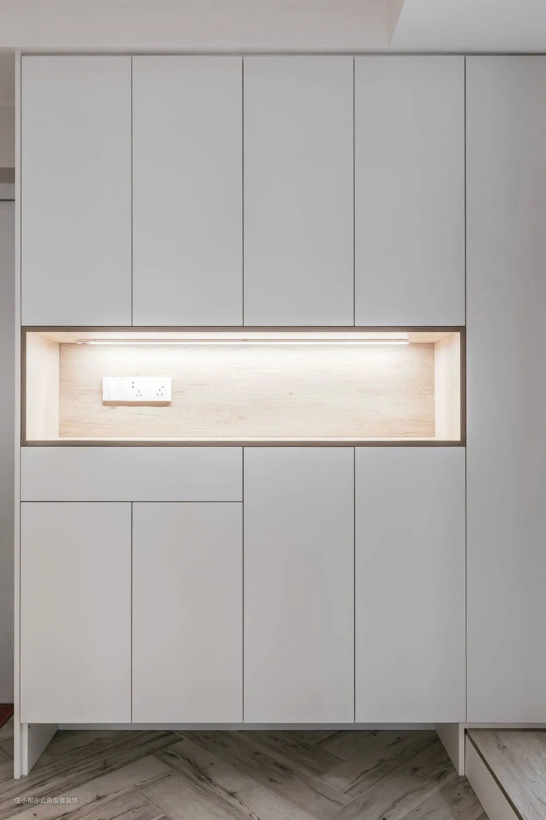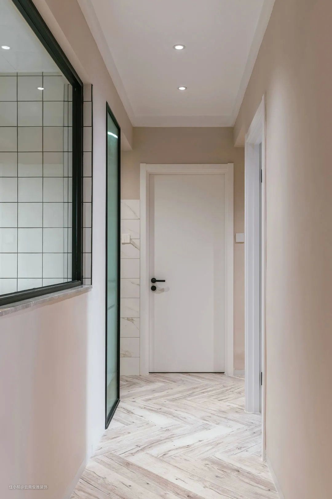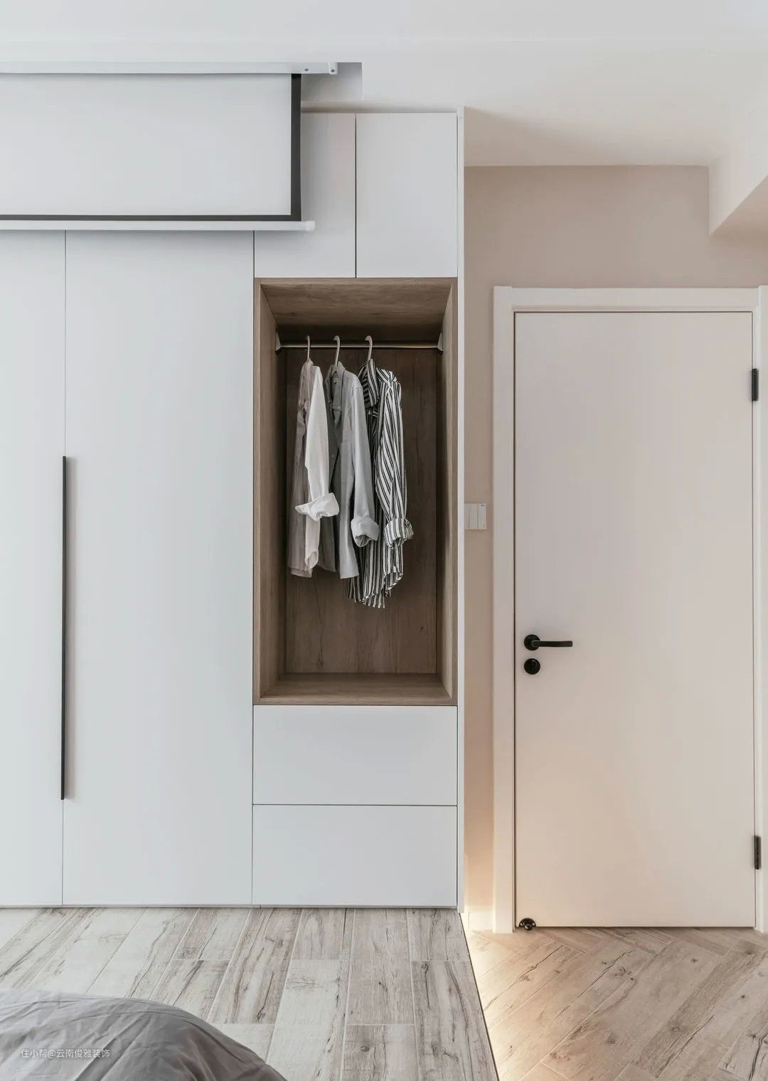 ▲走廊,木地板一直延伸到卧室门口,同样采用无主灯设计,整体统一更美观。
