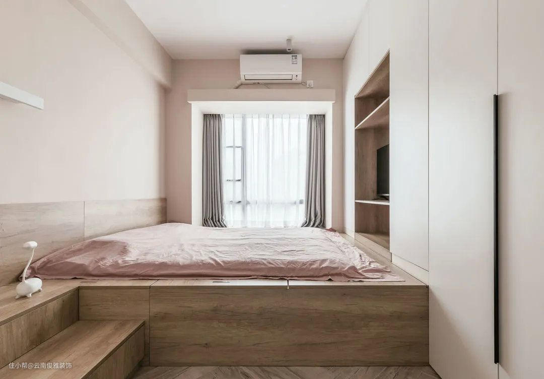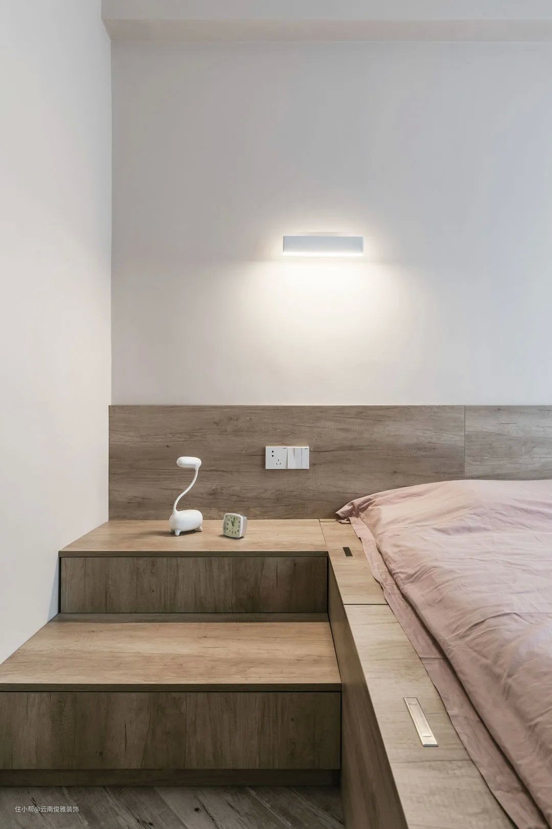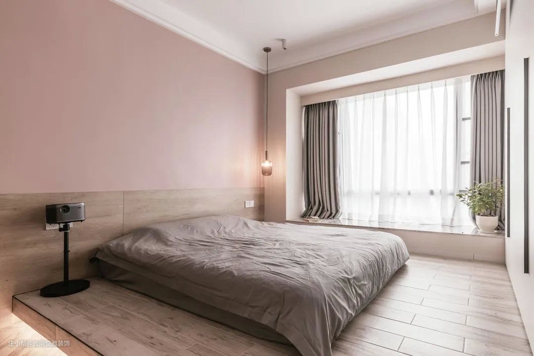 ▲主卧,打破了传统布局,用地台+床单代替床铺,淡粉色床头+灰色床品,再搭配一盏雅致优美的线性吊灯,营造出温馨舒适的睡眠环境。