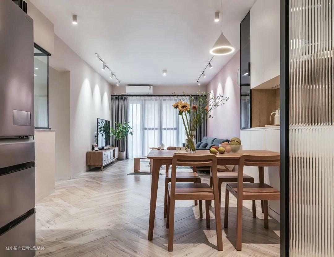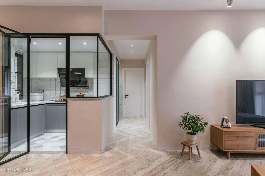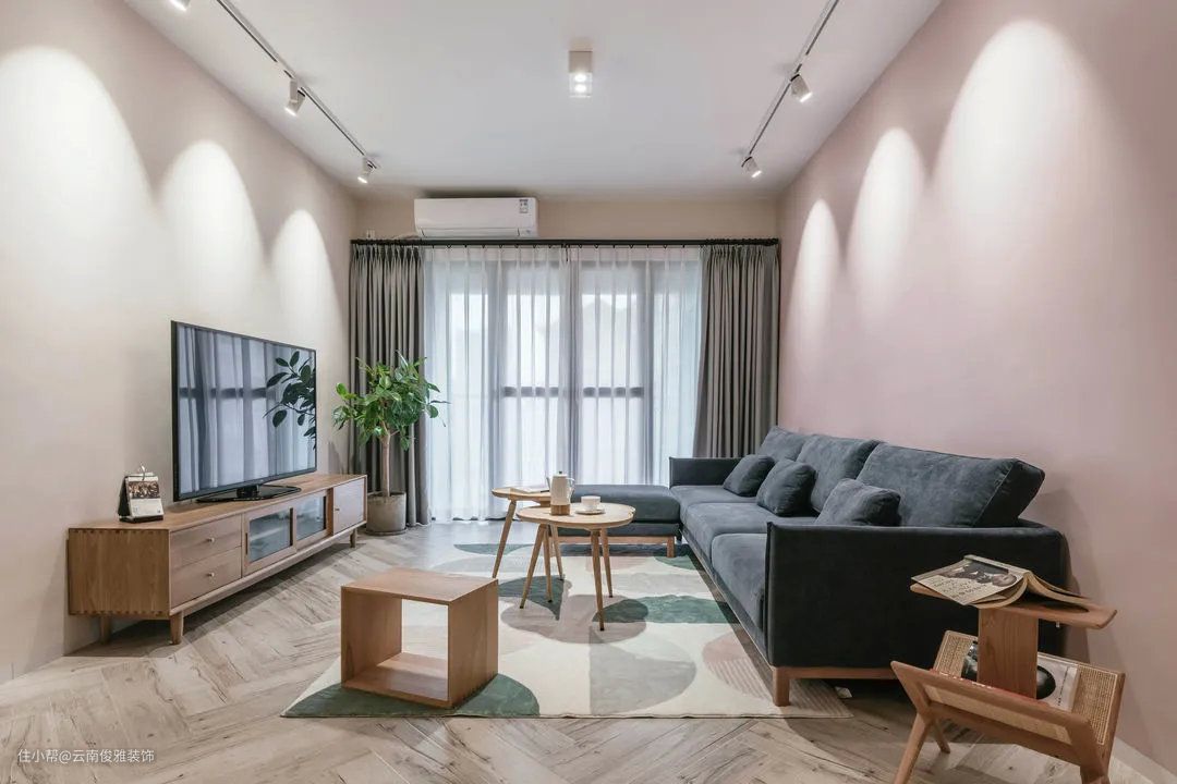 ▲客厅,电视墙没有多余的装饰,涂刷米色乳胶漆,搭配上原木电视柜,自然简洁很耐看。脏粉色沙发墙,搭配上浅灰色沙发,加上无主灯设计,看上去有些文艺小清新。