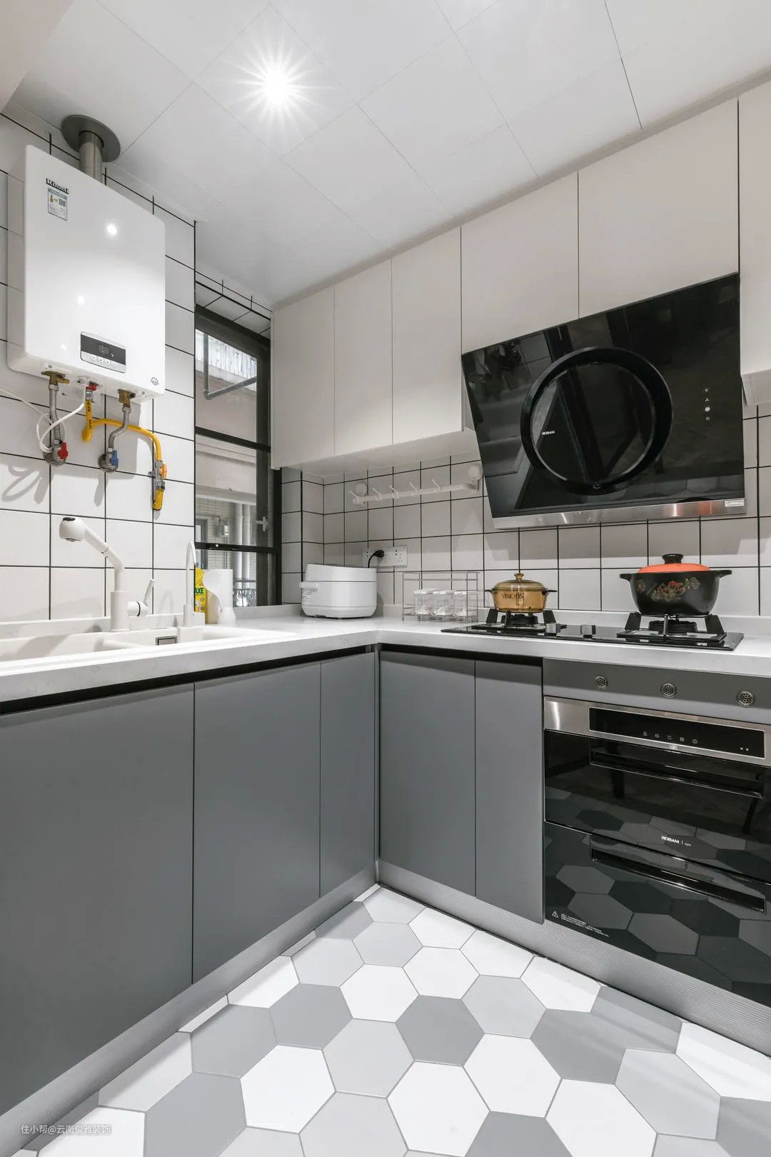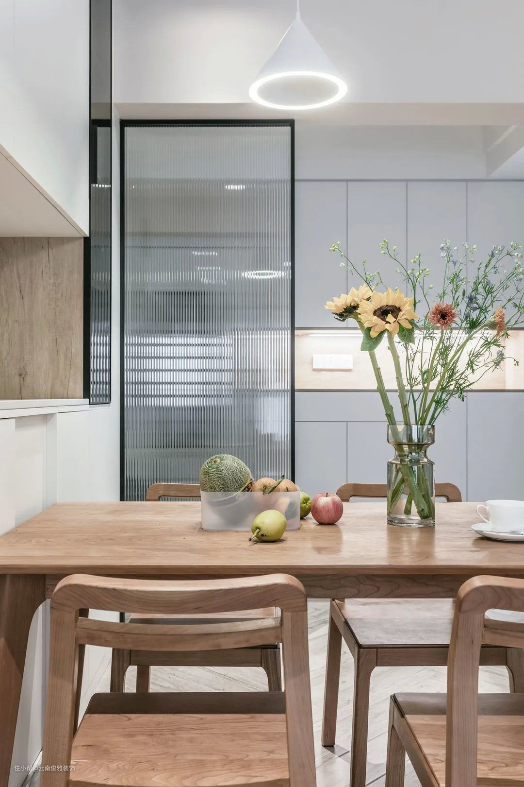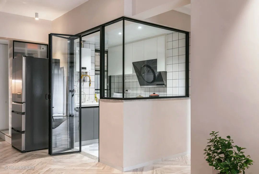 ▲厨房,采用半玻璃隔断,既有效地阻隔了油烟,还保证了良好的通透性。内部采用了U型的橱柜布局,必将冰箱外移,留出了超多的操作空间。