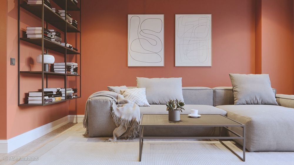 整体硬装布设很简单,清爽的基调,灰色蛋糕沙发搭配黑色铁艺茶几,非常高级,米色棉质地毯提升了空间温馨感,西柚红的背景墙非常显眼,配挂的两幅白板艺术画调和了色度,让人很舒服。