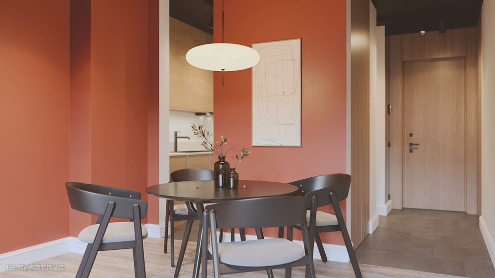 入门通过走廊,右侧便是餐厅,这是比较敏感的区域过渡地带,设计要求比较高,不能多一分,也不能少一毫,好在我们的设计师经验丰富,巧妙地以简易的圆面餐桌搭配几把U型餐椅,既完善了区域空能,又不会对空间造成阻碍。