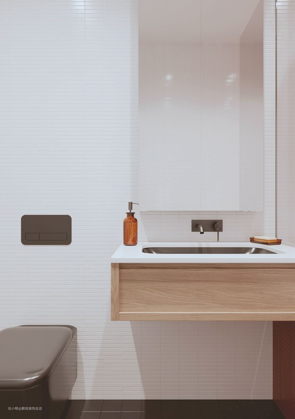 背景墙全部用乳白细条瓷砖铺设,充满质感,黑色地板很耐脏,最重要的是还防滑。
