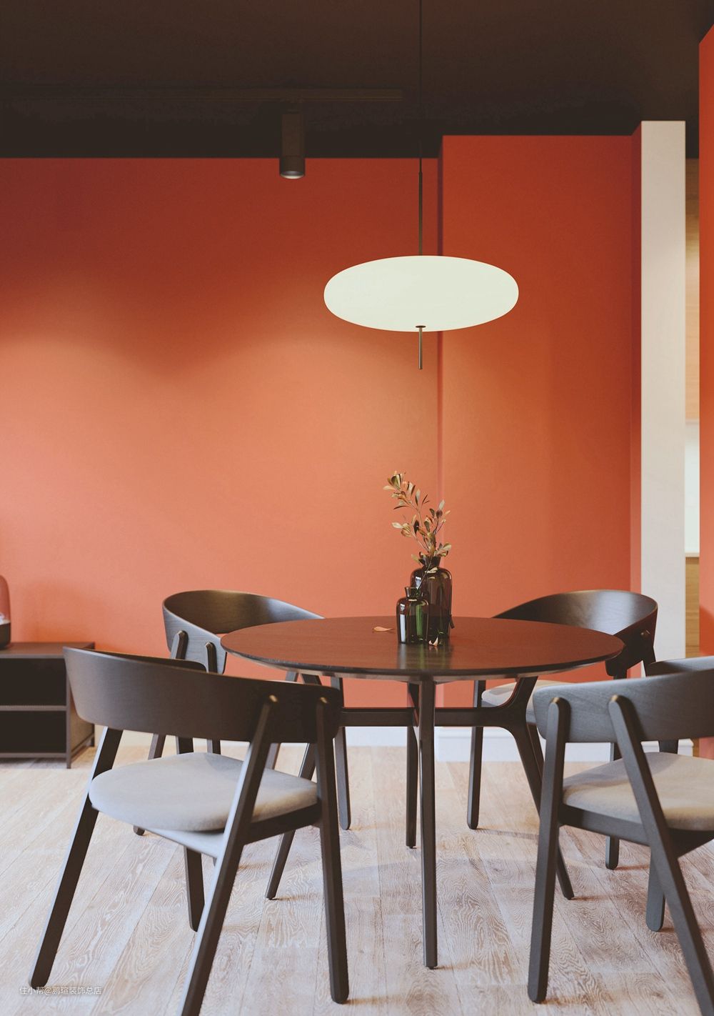 一盏圆盘吊灯轻松垂下,照亮了餐厅区域,简约大方,餐桌上摆放着棕瓶插花,尽显几分小情调。