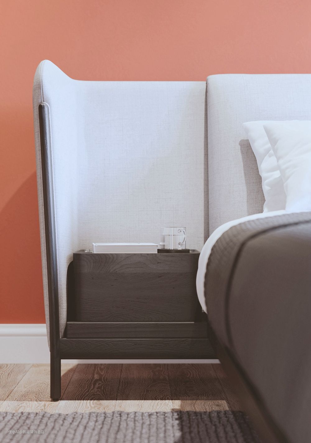 主卧延续了家居主色调,牛奶白的床体软搭,灰色的小地毯及床罩,营造出静谧的休憩氛围,西柚红的背景墙默默将空间点亮,凸显着生活的热情。
