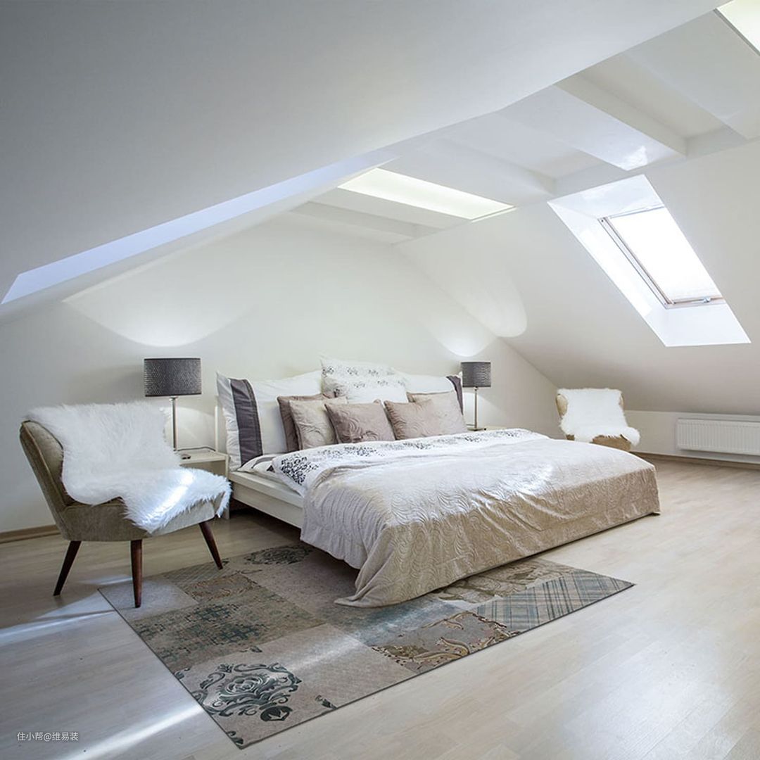 一般我们都很怕卧室的层高太低,睡觉的时候总是会感到压迫感。而这一个顶楼的设计比较特别,层高比较高之外,采光也十分明亮。以几件简单的纯白家具组成一个舒适的卧室,在这里睡觉,我怕我起不来!