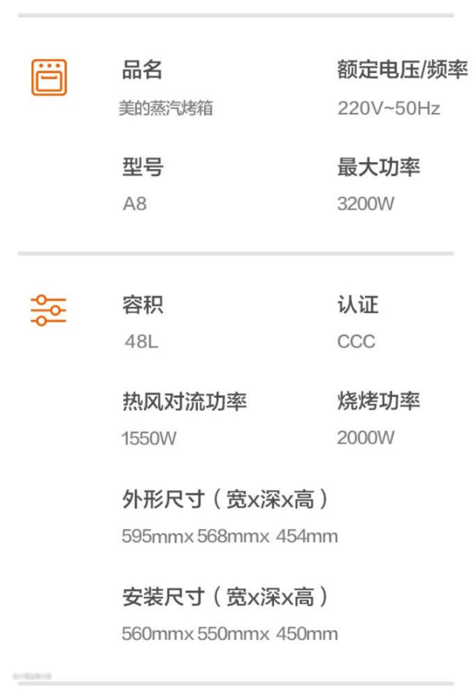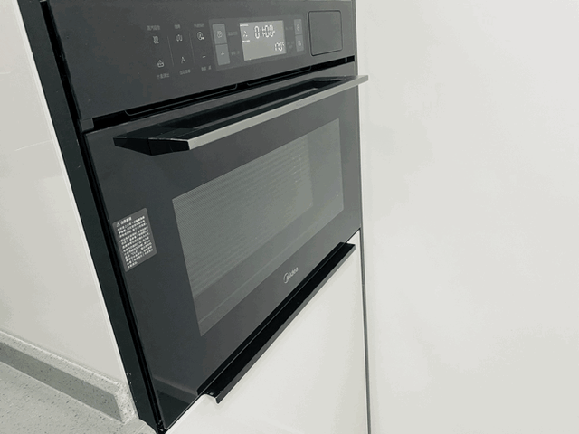 以美的A8这台蒸烤箱来说,48L的容积,安装高度45cm。相比之前Beko73L烤箱的60cm,足足降低了15cm。