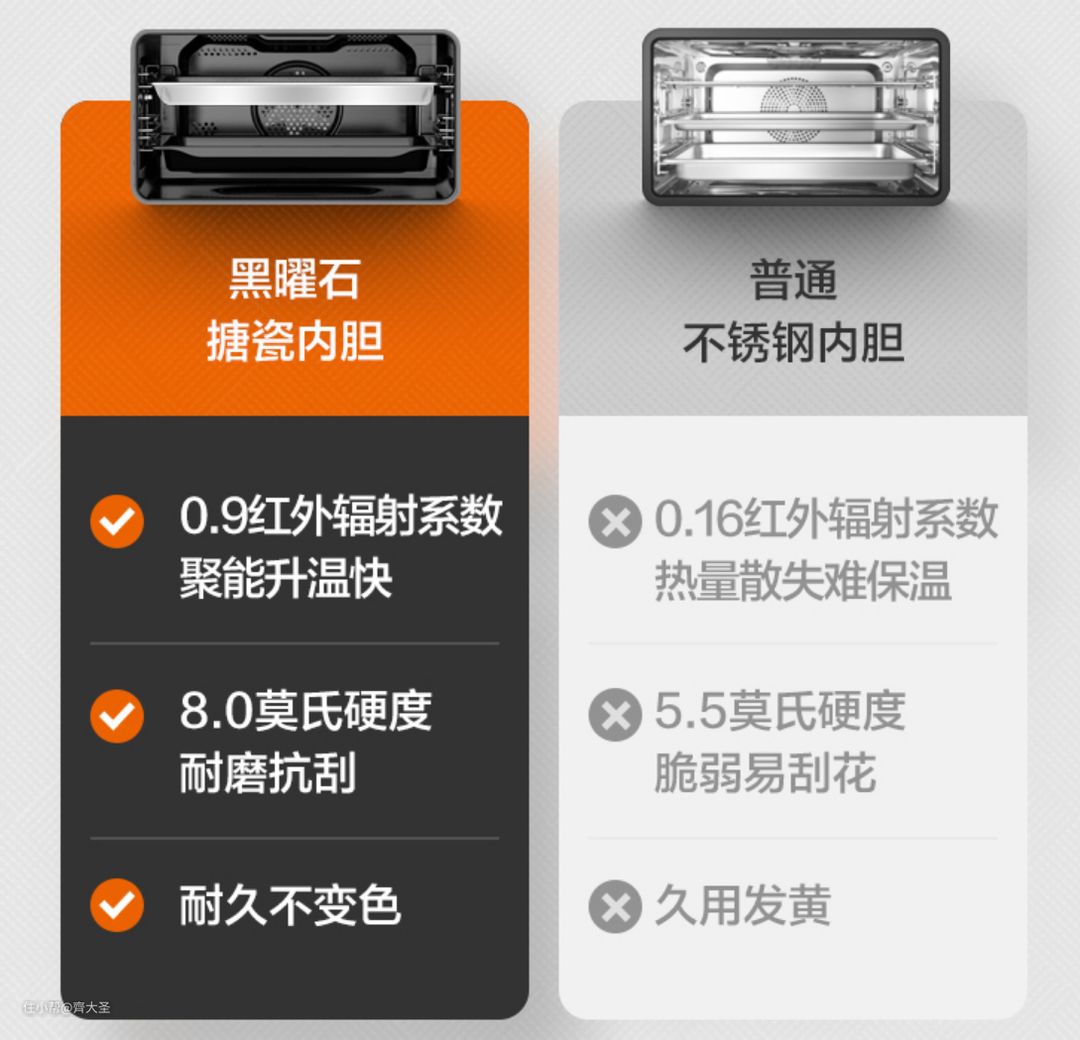 前文已讲过,单纯从材质上来说搪瓷耐高温易清洁,是蒸烤箱的最优选择,不过如果搪瓷工艺不达标,在蒸的使用环境下,蒸汽里的水分子会渗透到搪瓷内部,长时间的侵蚀会导致搪瓷内部金属生锈甚至穿孔造成安全隐患,因此一般搪瓷材质之前仅用在进口的高端蒸烤箱上。