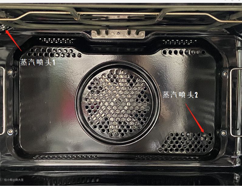 因此为了提升烹饪效果,高级一些的蒸(烤)箱均升级为蒸汽直喷式。美的采用的是佐帕斯直喷式蒸汽发生器,配备左右两个出气口,在管路中直接加热为水蒸汽,3200w大功率,10s快速出蒸汽,2min即可充满腔体,快速锁水,高温高效,真正实现“蒸”熟而不是“闷”熟。换句话来说,就是摒弃了传统“烧开水”的方法,不用我们手动加水,而是用蒸汽直喷的方式,更快更高效。