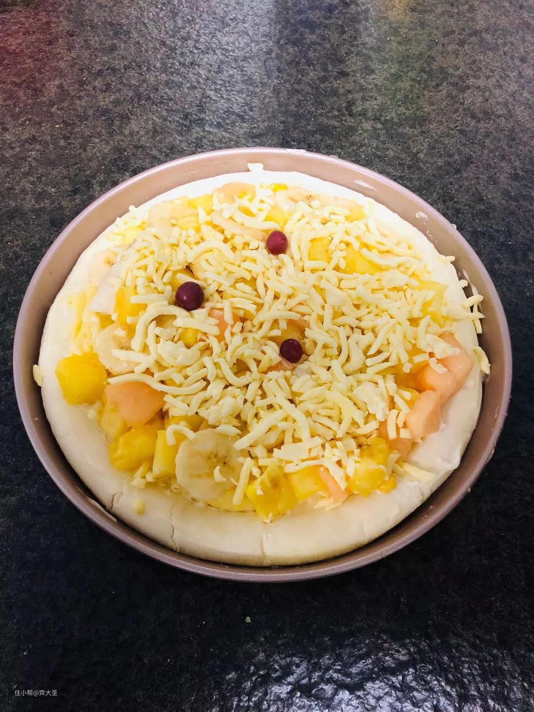 第一次做披萨,图省事买的现成的面饼,解冻后挤上沙拉酱,撒上马苏里拉芝士,上面铺上准备好的水果粒,最后再在披萨表面撒上一层芝士。