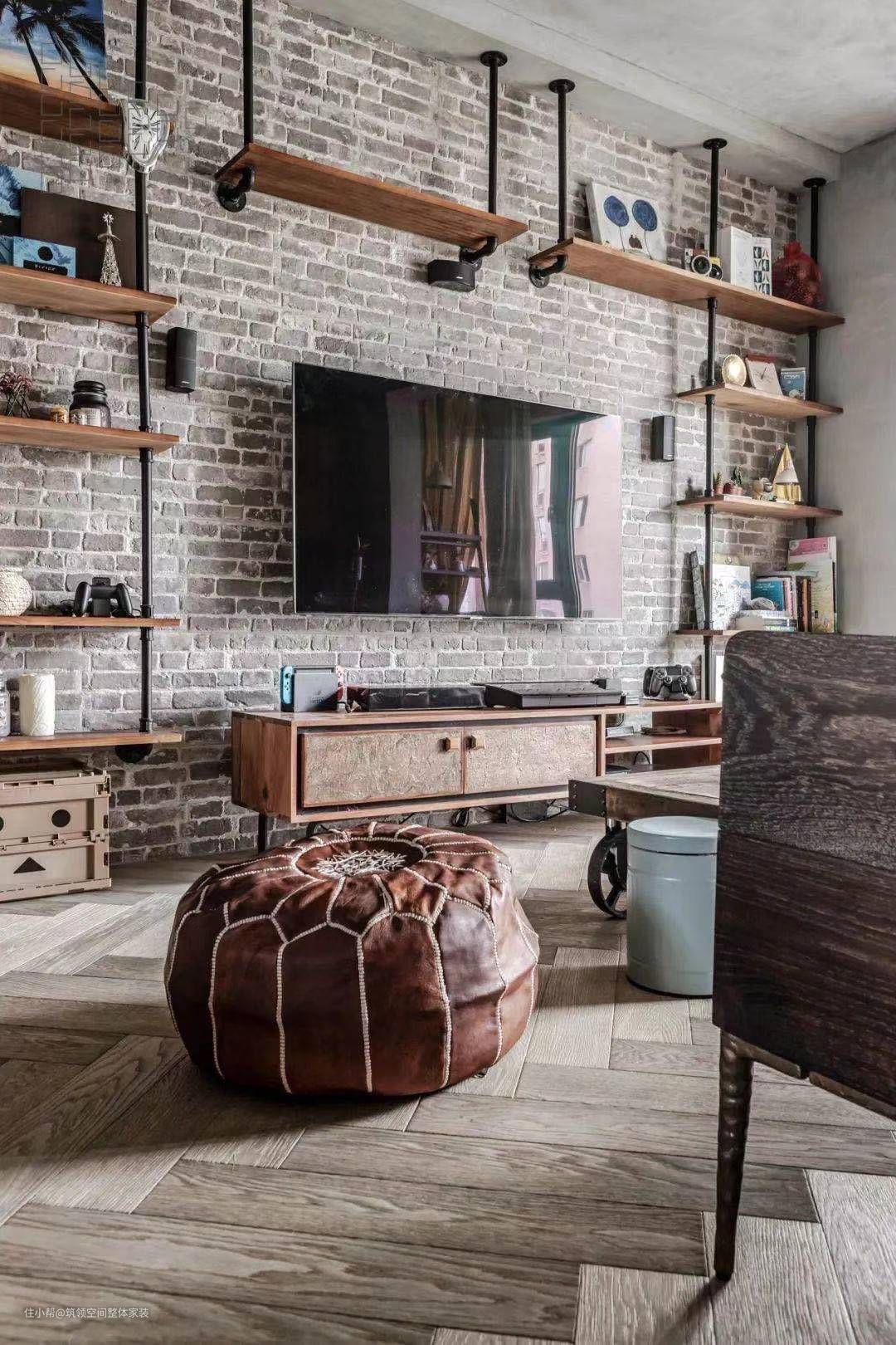 ▲红砖背景的电视墙,加入水管+木板组合的书架,摆上书籍与展示品,茶几是木板+铁艺轮子的组合设计,显得别致精致而小资大气。