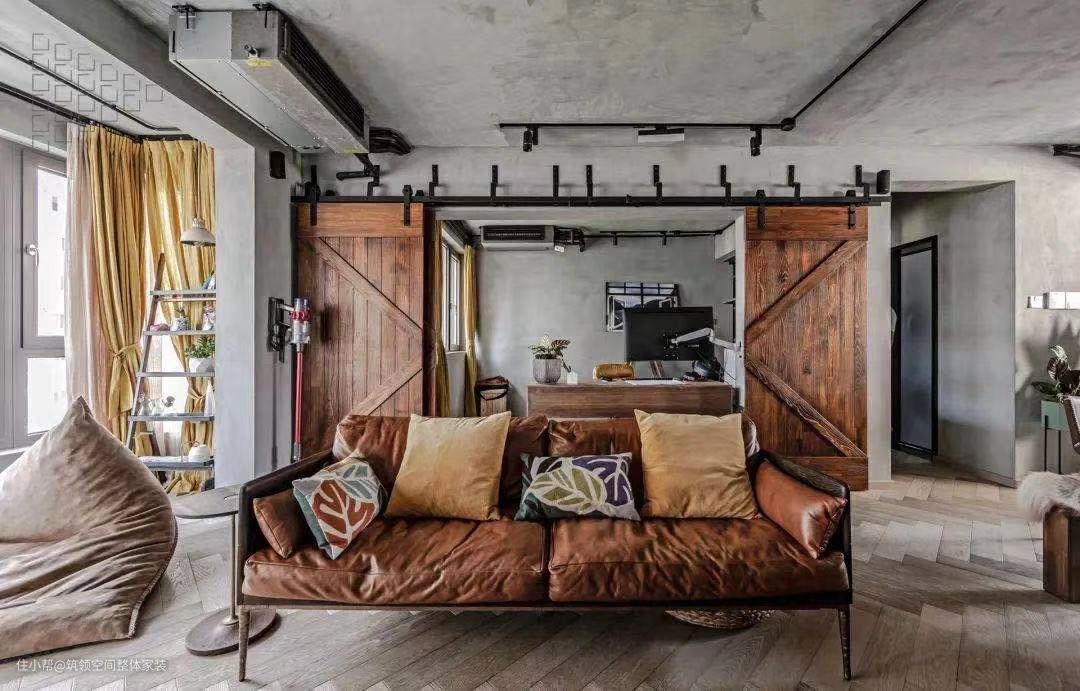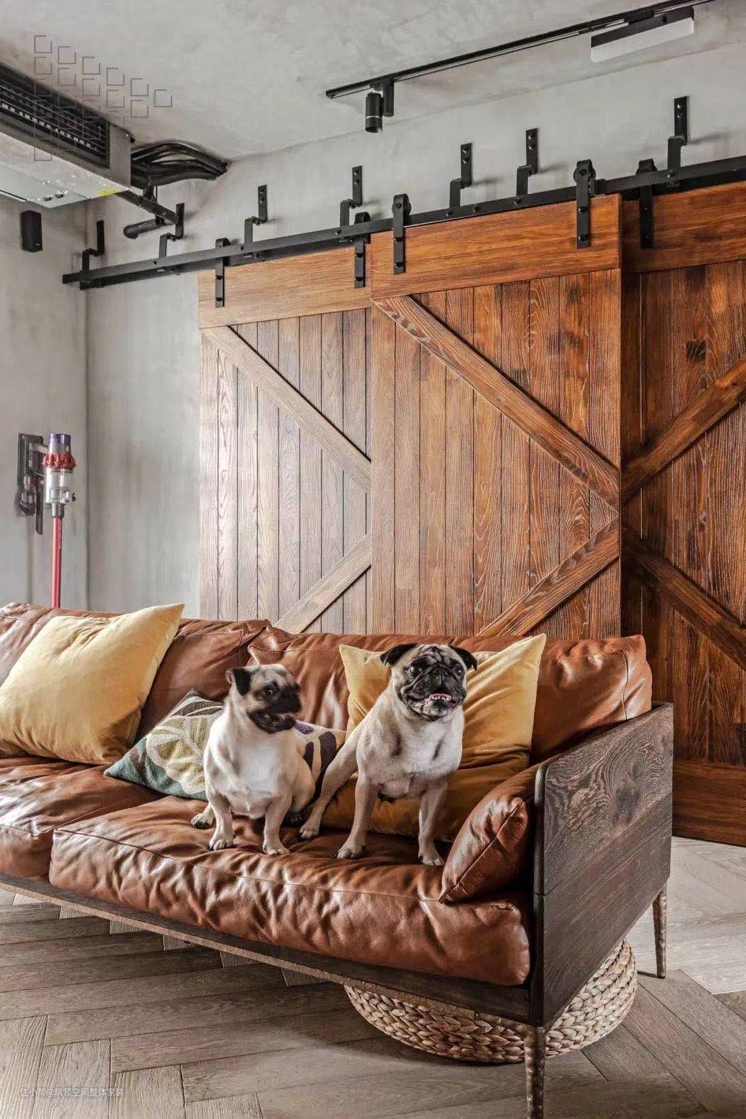 ▲实木框架的沙发,搭配棕色的皮沙发,后方复古调的木质谷仓门置入,呈现出一种自然从容的舒适气息。