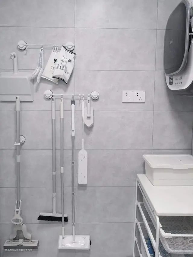 18、家里像拖把以及各类带长杆的清洁工具其实都可以用拖把挂钩让它们通通上墙,这样不仅可以沥水,而且能够释放更多的地面空间。