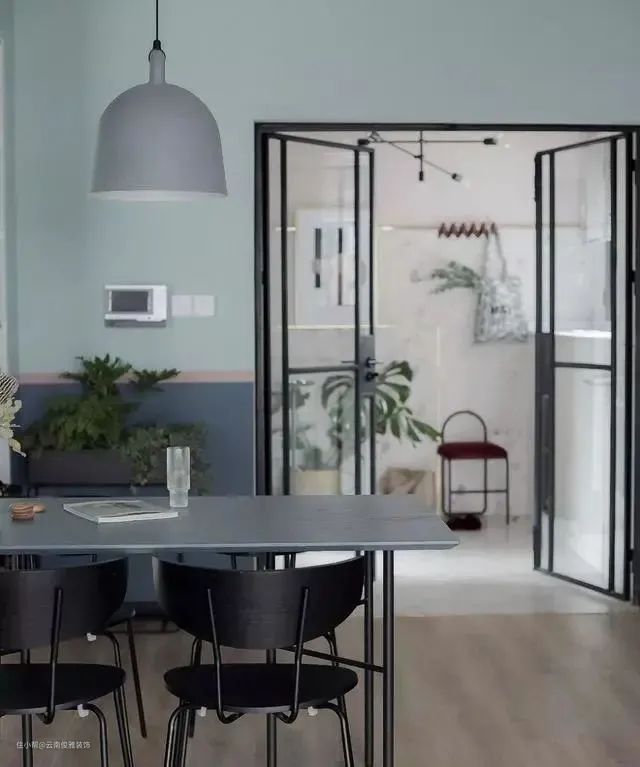 拆除了入户与餐厅的隔墙,安装透明玻璃双开平推门。引入更多光线,最大效率的利用采光,视野变的更为开阔,室内更显通透。