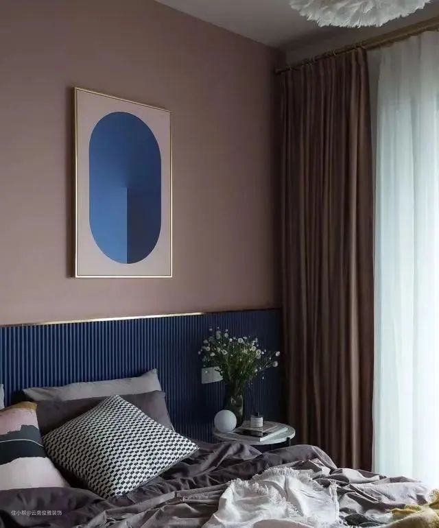 主卧的墙面大面积运用灰调棕粉色,营造出甜蜜柔和的氛围,复古优雅又不失高级感。
