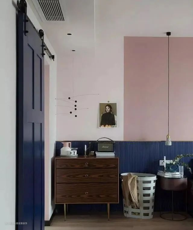 厨房选用蓝灰搭配裸粉,一深一浅相互叠加,巧妙的利用色彩为空间划分层次。