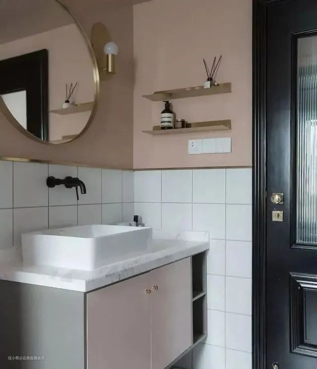 粉色的环境营造出温馨感,镜子和收纳台的选择加入黄铜元素。黑色门框,白色的瓷砖,黑白分明的撞色,提升空间的品质感与时髦感。