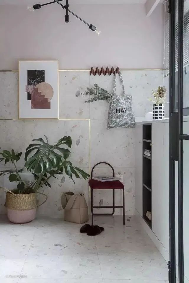 玄关的地板采用白色水磨石铺,墙裙搭配金属线条勾勒,更显精致。浅浅的粉色的天花板,整体显得温馨又浪漫。