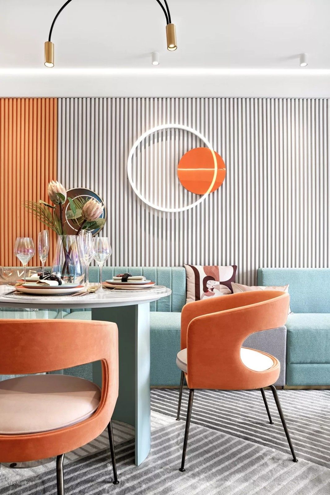 客餐区主色调为橙色和蓝色,清新的色彩抓人眼球,加上星星点点的灯,简约精致的桌椅,每一处都展现了餐厅特有的轻奢氛围。马卡龙色,静谧自然、轻松惬意,通过色调和色温的表达,层层递进中,颜色的传递与物象的表达,让你拥有一刻安宁与静谧的时光。