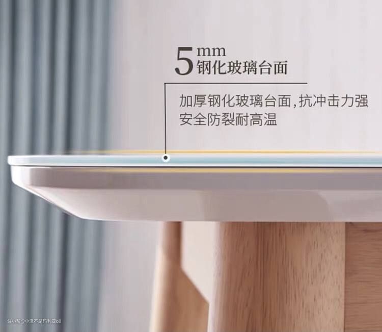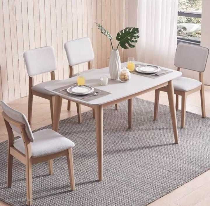 如果不能接受上面那款餐桌的后现代主义的风格,那么不妨来看看下面这套实木餐桌椅,简洁轻盈的造型以及明快的色彩,没有过多的华丽装饰,更加突出家具的实用性,符合现代简约风中的极简主义。5mm的白色钢化玻璃桌面比起实木桌面更加容易打理,跟浅色系的橡胶木桌腿搭配也是相得益彰,能够使餐厅的风格显得非常温馨、舒适。