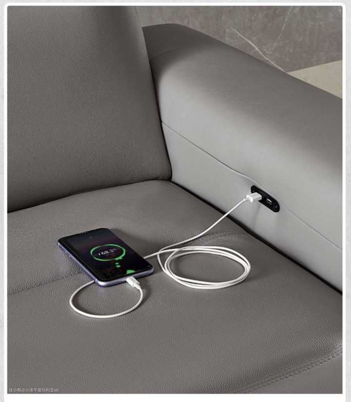 现代简约风的家具通常造型简约,同时又带有强烈的线条感,这款皮沙发风格简明大气,坐垫和扶手棱角分明,线条感强烈,虽然整体造型以简约为主,细节方面却保持了相当人性化的设计,贵妃塌右侧的扶手处设计了收纳杂质与遥控器的收纳袋,扶手内侧还配备有USB手机快充接口,对于手机不离手的当代都市人群来说相当实用,沙发有真皮和科技布两款材质可以选择,底部的金属支脚高15cm,扫地机可自由出入。