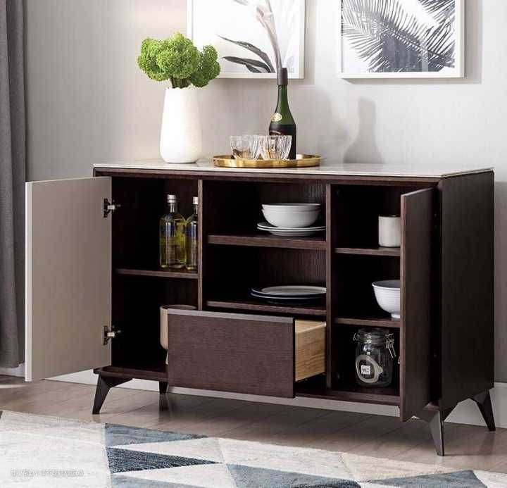 喜欢收集各种精美餐具的你,怎么能够少得了一款实用的餐边柜,这款餐边柜的外形老实说的确是保守了一些,但却绝对能“装”。两侧的柜门打开后你会发现他的内部格局并不同于他简约的外观,两边的隔断可以放置红酒以及各种调味料,中间的隔层可以收纳碗碟,底部的抽屉则可以放置勺、筷。将餐边柜放置于餐厅就能省去每次拿去东西都要跑去厨房的烦恼,顶部的灰瓷石台面还可以放置各种厨用小电器,非常实用。