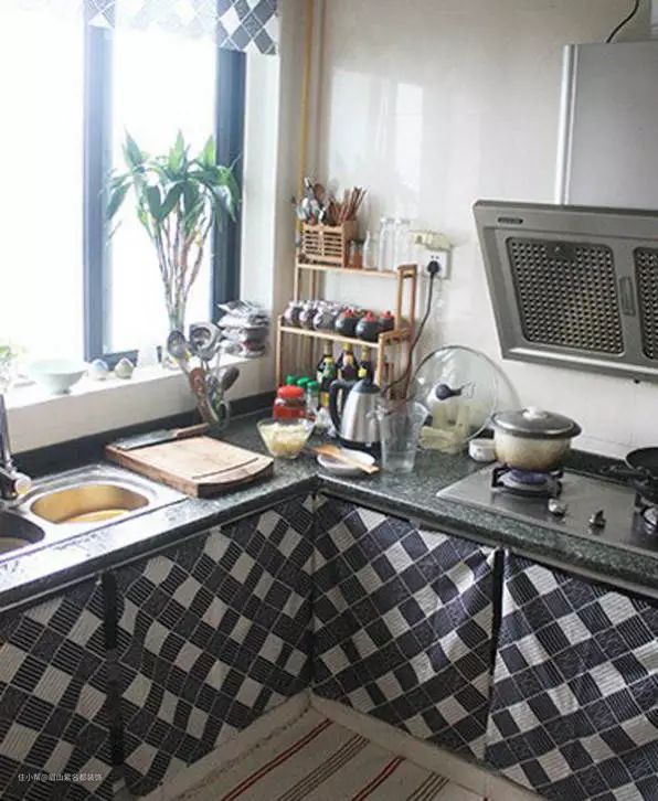 厨房装饰后:增加了窗帘和柜橱下的柜门,用同样的格子布料,让原本沉闷的厨房一下子小清新风刮起来。