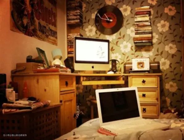 一个老式的书桌,把一侧小面积墙面用墨绿色花纹壁纸,加上胶片上墙做装饰,分分钟就会变出时髦的不得了的混搭感。