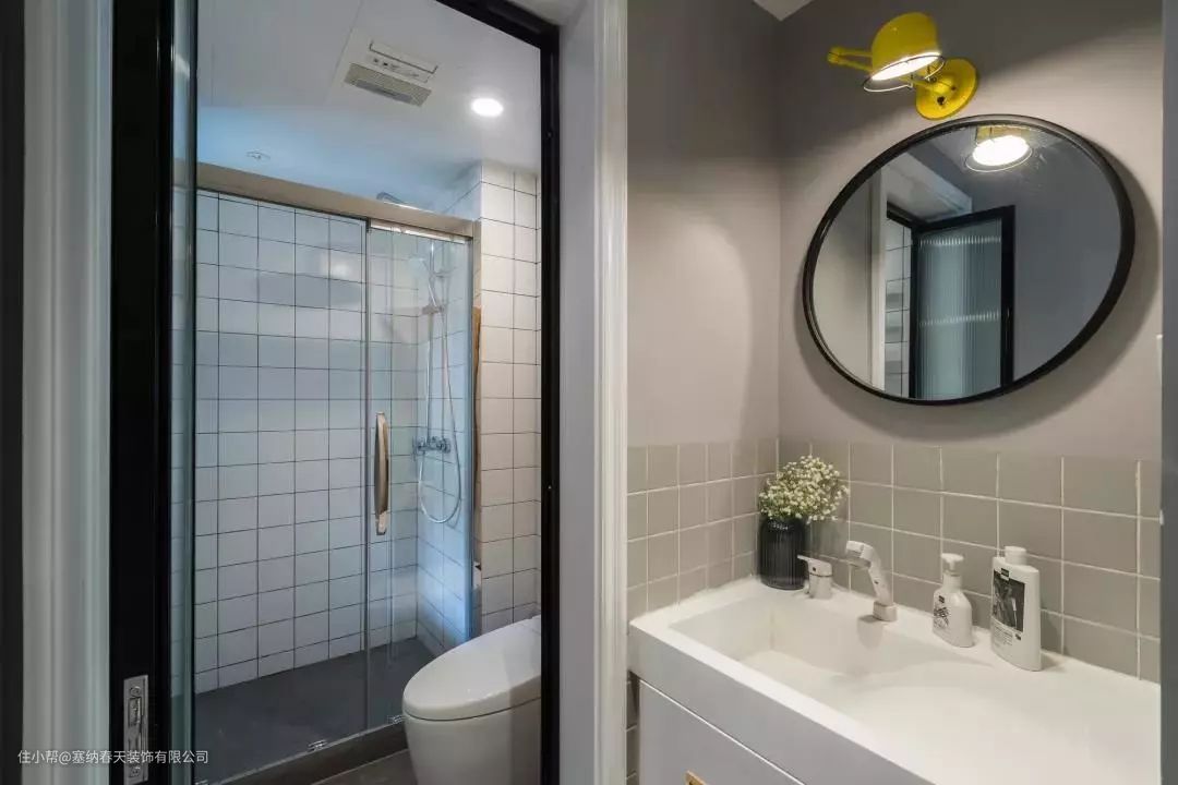 卫生间做了干湿分离,地面和墙面还是主色调低调的浅灰色,圆形镜子上有一个黄色的小臂灯,用来补充照明。