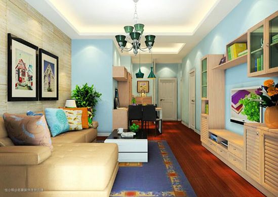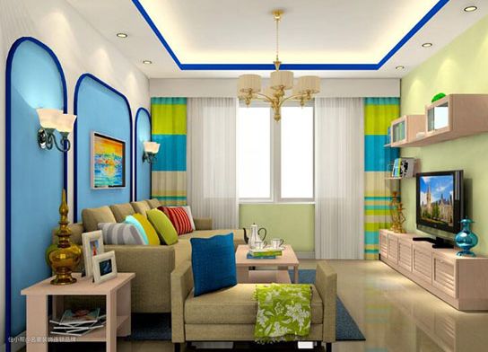 在家具色彩显得非常地雅致,粉色的电视柜显得家居奢华而大气,这种柔美浅色调的家具会给人一种比较舒服的视觉体验,沙发组合搭配也是不错的,色调也显得非常地优雅,蓝色的沙发背景墙装饰和浅绿色的电视背景墙的装饰都很自然。