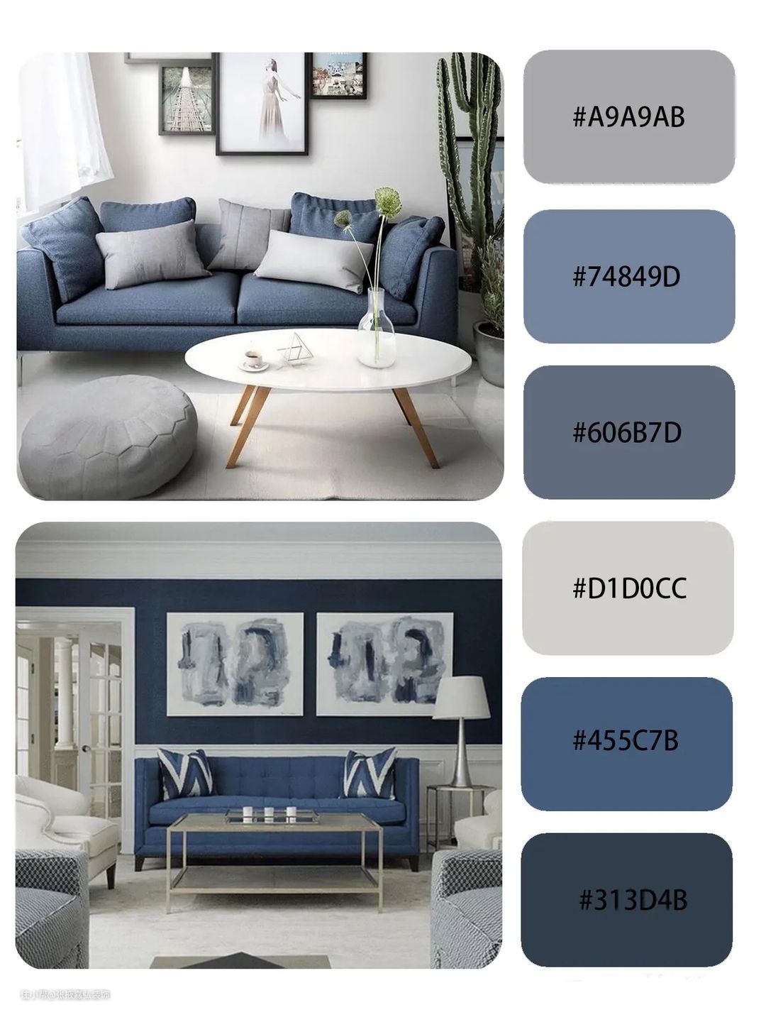 蓝色沙发和白墙搭配起来,会缓和蓝色的中性感,令整个感觉更柔和。