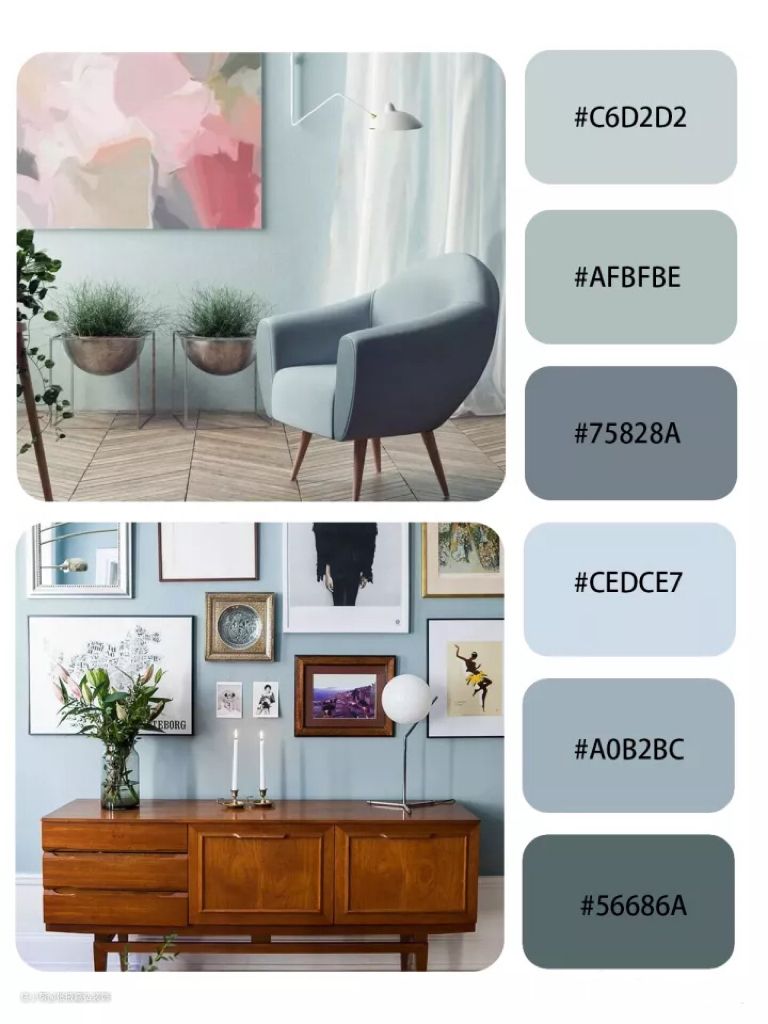 属于冷色的雾霾蓝同样有安宁的效果,同时又多了一分理性和严谨。