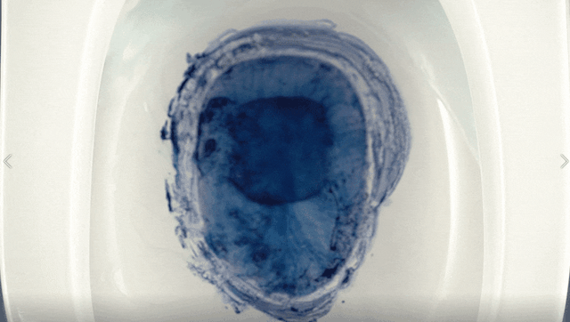 接着来看看我们的大白双擎增压智能马桶,同样多的蓝墨水涂抹内壁,水流贴壁快速冲刷,快速带走墨水,没有多余残留,一次就冲刷干净了。