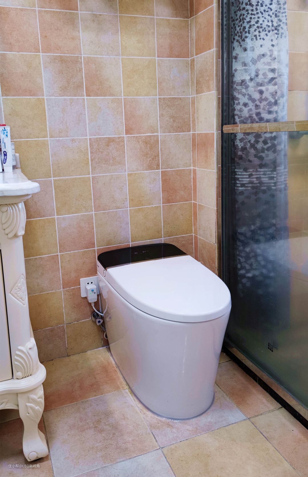 这个卫生间的坑距留得并不标准,305的坑距,实际就300左右,而且当时装修预留的出水口和电源接口都比较近,也差点因为这个影响安装。不过后来安装师傅稍微将马桶位置做了微调,才刚好可以装下。也得益于这款大白智能马桶并不像市面大部分的智能马桶那样设计的过于臃肿,虽然带了水箱,但依然简洁小巧,对于小户型用户,这款智能马桶超薄设计还是非常适合的。